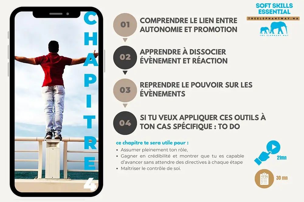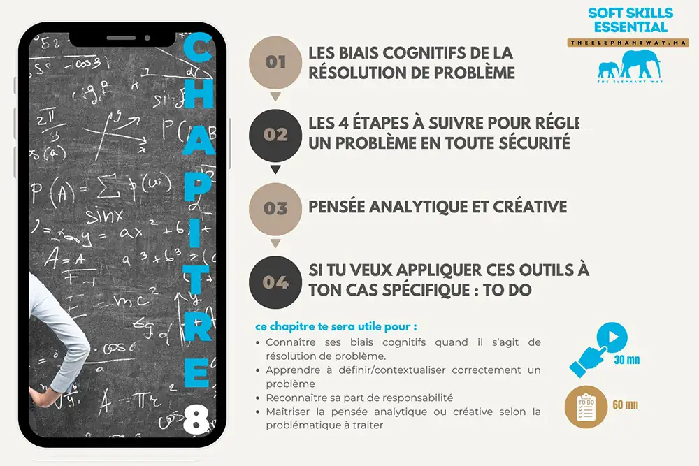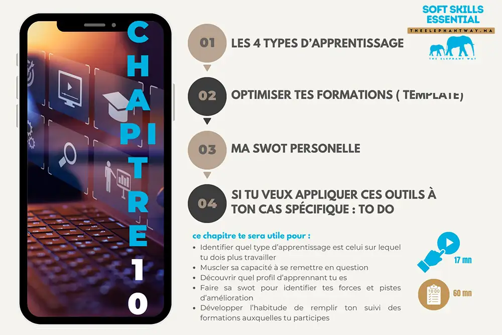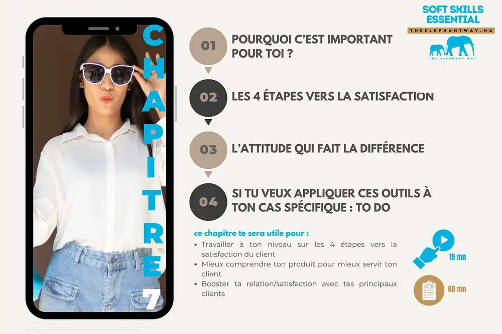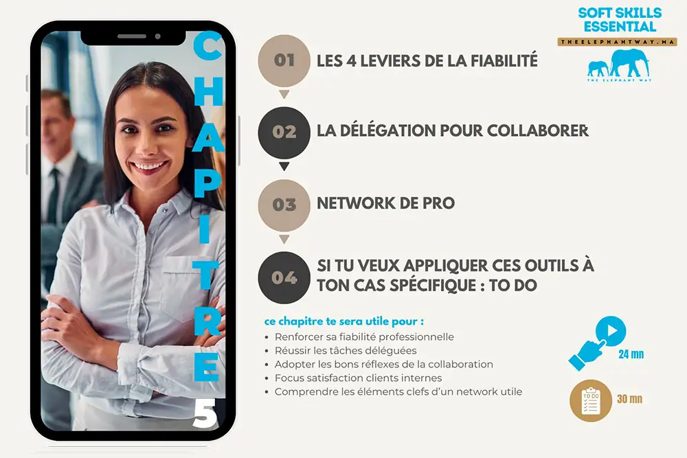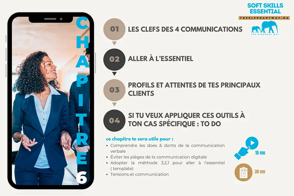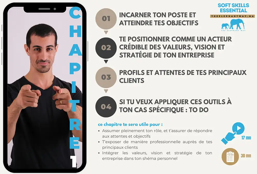 Avec Soft Skills Essential, je rends ces compétences accessibles à tous de manière concrète, rapide et simple : en 18 minutes par chapitre, pour 299 DH, vous maîtriserez dès aujourd’hui les soft skills indispensables à votre avenir.
